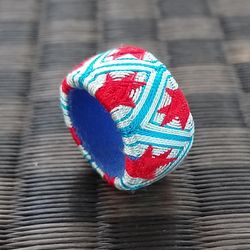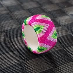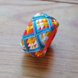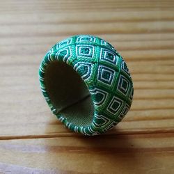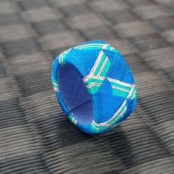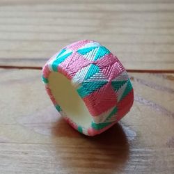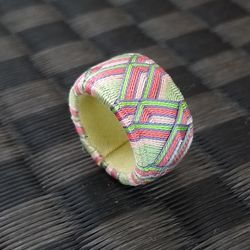 ゆびぬきを横に寝かせた状態で、表面に見える三角形が縦に出る模様。開き刺しを用いて作ります。コマ割りの数によって、三角形の数や大きさが変わります。かがる絹糸の色を増やすことで、三角形から菱形が現れるのが面白い模様でもあります。