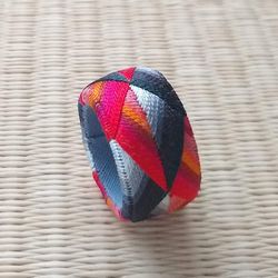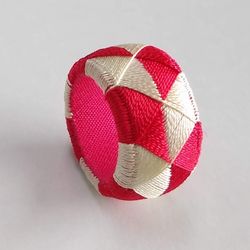 かがり始めるスタート位置が5ヶ所になります。コマ数を増やしていくことで、三角形がより小さくなり、角度をかえるごとに糸がキラキラと見えて美しい模様です。