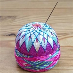 いつもよりずっと大きな土台を使用。外周が長くなり、模様によってはかがる時間が倍以上にもなります。今回は、飛び数の大きな矢羽根模様で。針山部分はHANAtemariWorks様のてまりを差し込んでます。 |