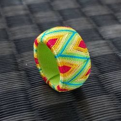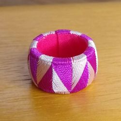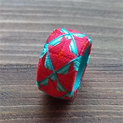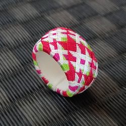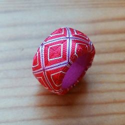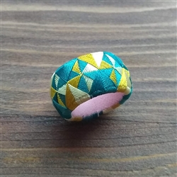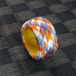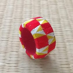 ゆびぬきを横に寝かせた状態で、表面に見える三角形が縦に出る模様。開き刺しを用いて作ります。コマ割りの数によって、三角形の数や大きさが変わります。かがる絹糸の色を増やすことで、三角形から菱形が現れるのが面白い模様でもあります。
