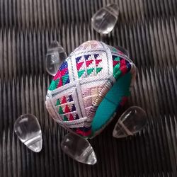 小さなうろこを、大きな縞で囲んで。アクセントに金糸を。 |