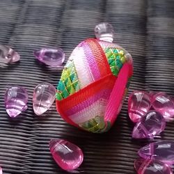 うろこ模様と基本的には同じ作り方ですが、かがりの途中で一部分をくぐったり、重ねたりすることで、最終的に違った見た目に仕上がる模様です。途中までが、うろこ模様という面白い構図になります。工夫次第で模様を変化させられる楽しさが感じられます。